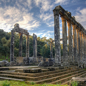 Plus à l’ouest, à proximité du port et de la ville antérieure à l’époque romaine, en y accédant par des rues bordées de colonnades corinthiennes (partiellement préservées), se trouvent les vestiges d’un temple d’Apollon, partiellement restauré. Le temple d’Athéna, lui aussi et date probablement de la même époque. Il est aujourd’hui largement détruit (n’en reste que les bases de quelques colonnes). La ville était alimentée en eau à l’époque romaine par un aqueduc arrivant par le nord-est et qui est encore bien conservé.