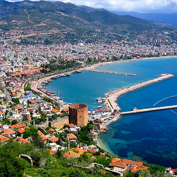 Alanya anciennement nommé Alaiye, est une ville balnéaire et un district de la Province d’Antalya dans la région méditerranéenne de la Turquie, à 166 km à l’est de la ville d’Antalya. Sur la côte sud de la Turquie, le district (qui comprend la ville et son agglomération) a une superficie de 1.598,51 km² et 248.286 habitants. En raison de son emplacement stratégique naturel sur une petite péninsule dans la mer Méditerranée à proximité des Monts Taurus, Alanya a été un bastion local pour de nombreux empires méditerranéens tels que l’empire ptolémaïque, l’empire séleucide, l’empire romain, l’empire byzantin, ou encore l’empire ottoman. L’importance de la ville d’Alanya s’est grandement développée au Moyen Âge avec le sultanat de Roum sous le règne d’Kay Qubadh Ier, dont la ville tire son nom. Cette époque de construction a entraîné un grand nombre de création de monuments laissant un héritage culturel marquant à la ville (Kule Kızıl “Tour Rouge”), le Tersane (Chantier Naval) et le château d’Alanya).