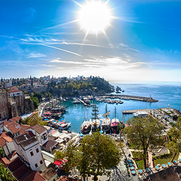 Antalya est une grande ville touristique du sud de la Turquie dans la préfecture de la province du même nom. Elle dispose d’un aéroport international, l’aéroport d’Antalya. Antalya est aujourd’hui la capitale touristique de la côte méditerranéenne turque, surnommée la «Riviera Turque»; elle peut même être considérée comme l’une des stations balnéaires la plus fréquentée au monde (plus de 9 millions de touristes annuels en 2010). La vieille ville d’Antalya, Kaleici, s’allonge au flanc d’une falaise abrupte en bas de laquelle se niche un ancien port, aujourd’hui port de plaisance moderne. La population d’Antalya se monte à 798.507 habitants en 2008.