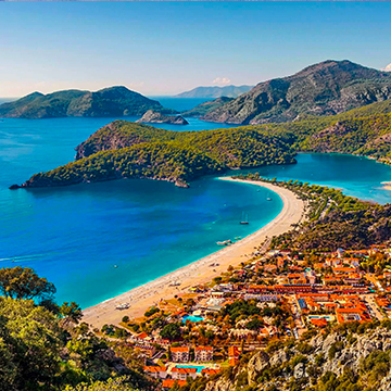 Ölüdeniz est un petit village de vacances de la région égéenne sur la côte sud-ouest de la mer Égée en Turquie. Située sur la face sud du mont Babadağ, le village bénéficie de l’héliotropisme et de la beauté de son environnement naturel; la plage du lagon bleu est une des plus photographiée de la mer Méditerranée. Le lagon d’Ölüdeniz est une réserve naturelle nationale et les constructions sont strictement interdites, il est célèbre pour ses nuances de turquoise et aigue-marine. La plage bénéficie du pavillon bleu récompensant les plages à haute qualité environnementale et elle est souvent classée parmi les cinq plus belles plages du monde par les voyageurs et les revues de tourisme. Il est également possible de faire du parapente autour de la station balnéaire, bénéficiant de vues panoramiques uniques et de la hauteur exceptionnelle de la montagne Babadağ en bordure de mer.
